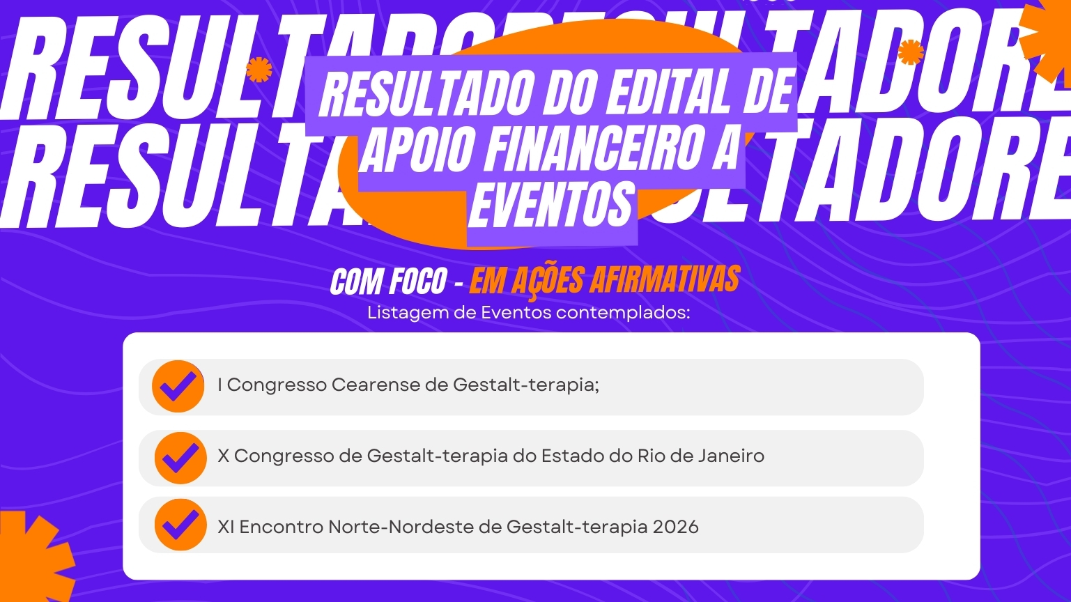 A Associação Brasileira de Gestalt-Terapia e Abordagem Gestáltica (ABG) torna público o resultado do Edital de Apoio Financeiro a Eventos com Foco em Ações Afirmativas para 2026. Foram contemplados os seguintes eventos: